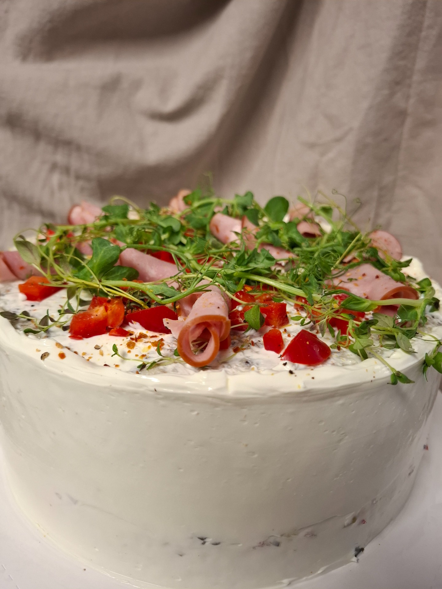Kyökin herkullinen kinkku-salamivoileipäkakku sisältää runsaasti tuorejuustoa, kinkkua, salamia, paprikaa, maustekurkkua, puna/purjosipulia, persiljaa ja mausteet sekä itse leivotun vaalean leivän leseillä ja siemenillä. Päällä on tuorejuustoa, salaattia, kinkkua, salamia ja paprikaa.